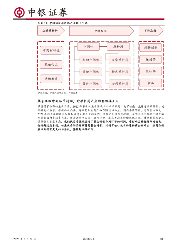 海翔药业是一家覆盖医药中间体、原料药及染料业务产业链的综合企业, 拳头产品培南类药物和克林霉素原料药全球占比高, 兼具规模和全产业链优势, 并以此为基础纵向拓展制剂业务。 C(D)MO 业务已与海外优质客户达成长期合作,近两年扩大投入,进行深度合作。染料业务方面公司是全球活性蓝 KN-R 细分赛道龙头,近两年因下游纺服消费端不景气导致短期板块收入和利润承压,预计 2023年迎来拐点。 首次覆盖给予买入评级。
