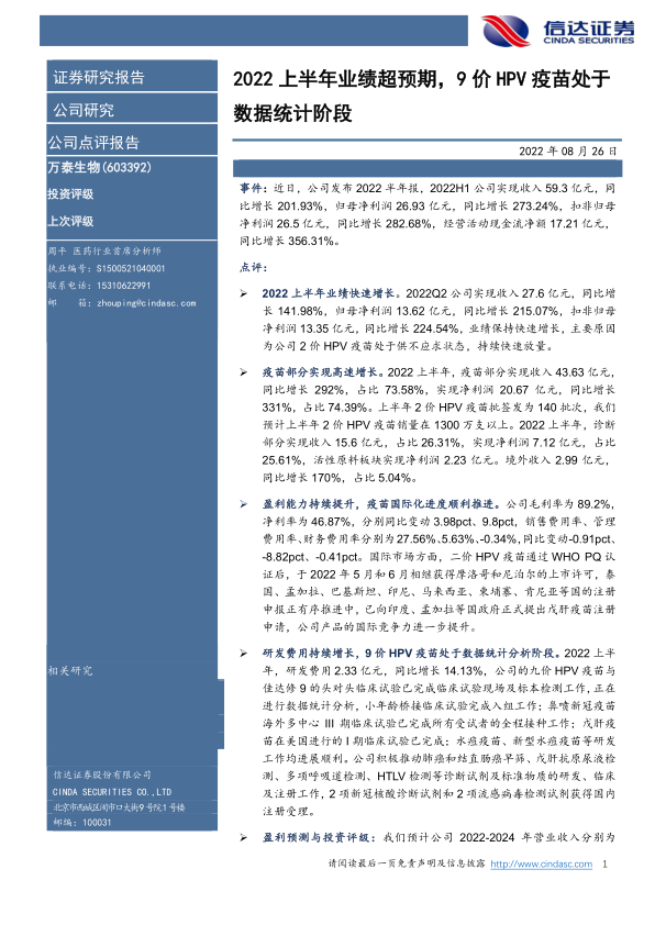2022年上半年及二季度,公司收入和归母净利润均实现显著增长,主要得益于二价HPV疫苗的强劲销售。