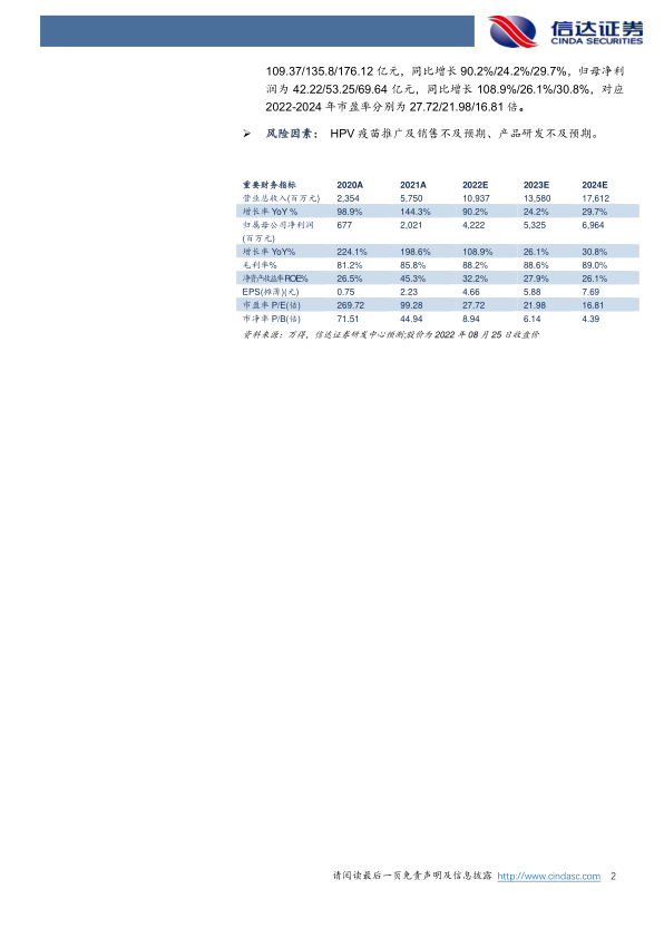 风险因素:HPV疫苗推广及销售不及预期、产品研发不及预期。