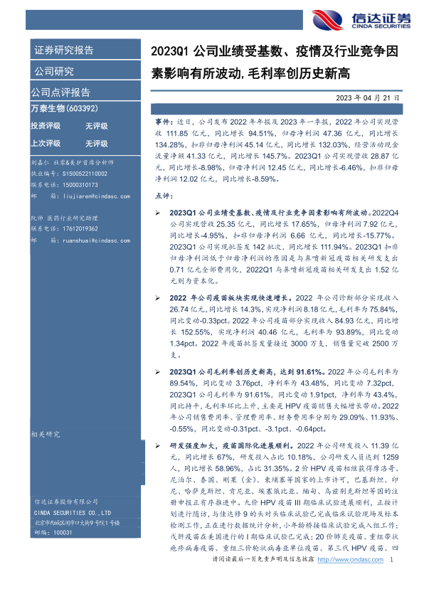 本报告对万泰生物2022年年报及2023年一季报进行了深入分析。尽管短期业绩受到基数、疫情和行业竞争的影响,但公司疫苗板块依然保持快速增长,毛利率创历史新高,显示出较强的盈利能力。同时,公司持续加大研发投入,积极拓展国际市场,为未来的发展奠定了坚实基础。