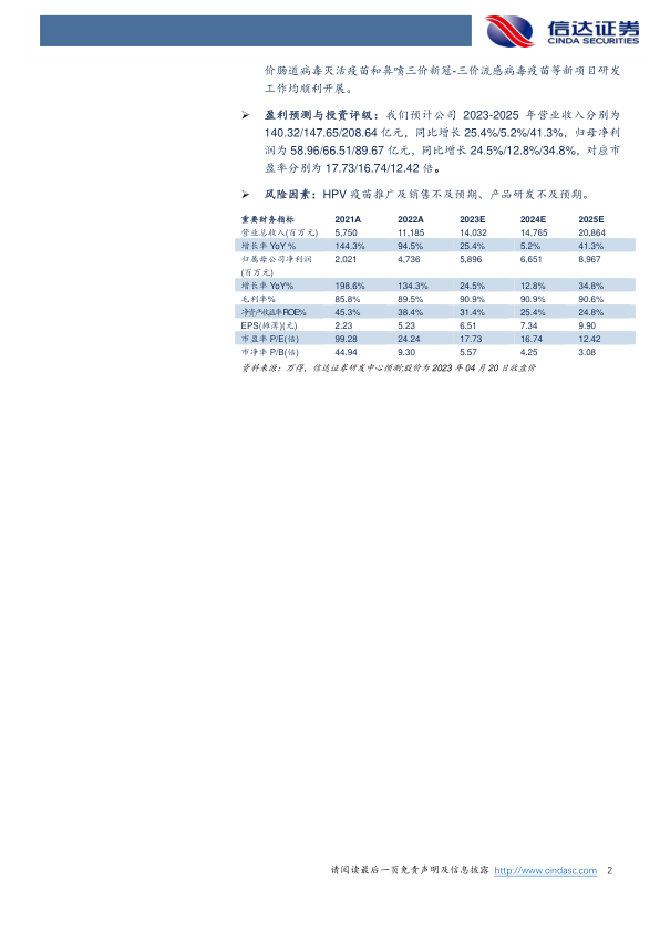 风险因素:HPV疫苗推广及销售不及预期、产品研发不及预期。