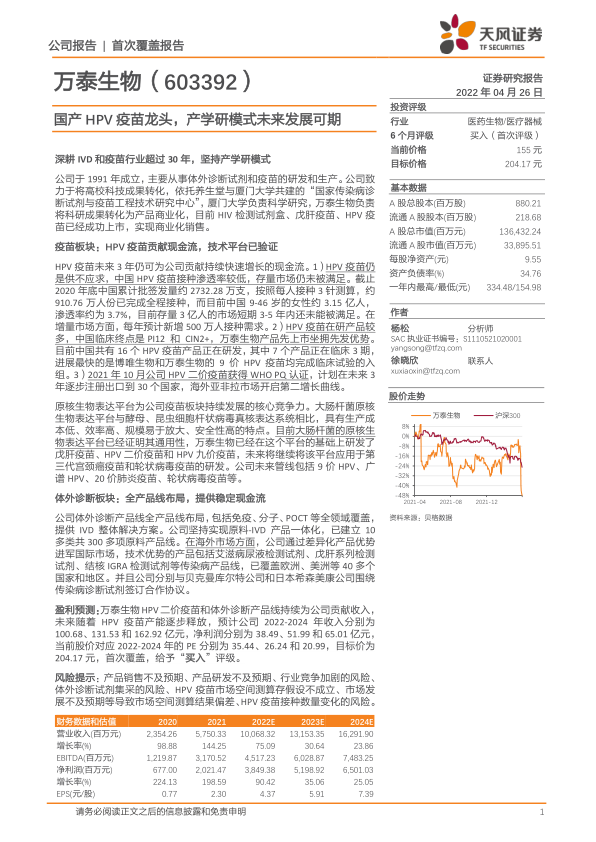 盈利预测:万泰生物HPV二价疫苗和体外诊断产品线持续为公司贡献收入,未来随着HPV疫苗产能逐步释放,预计公司2022-2024年收入分别为100.68、131.53和162.92亿元,净利润分别为38.49、51.99和65.01亿元,当前股价对应2022-2024年的PE分别为35.44、26.24和20.99,目标价为204.17元,首次覆盖,给予“买入”评级。