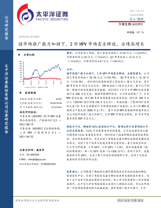 万泰生物在强市场推广能力的支持下,受益于 2 价 HPV 疫苗市场需求的释放,业绩实现高增长。公司前三季度收入和净利润均大幅增长,预计全年 2 价 HPV 疫苗销量可观。
