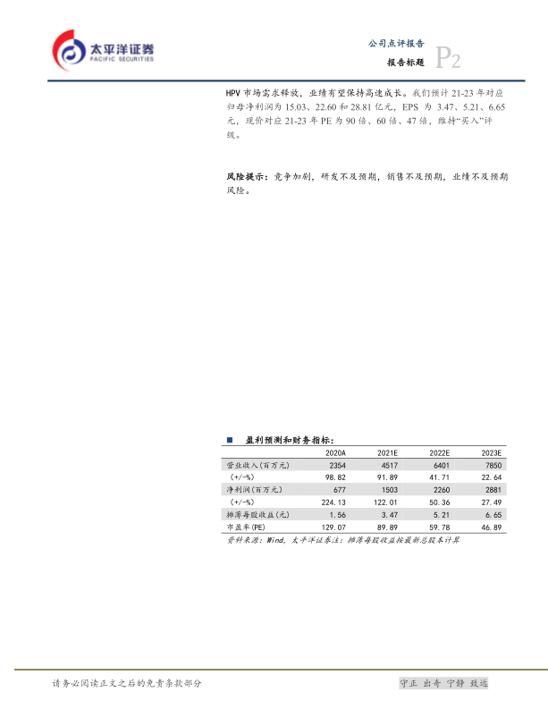 投资建议:公司搭建了稀缺的大肠杆菌原核表达系统的病毒样颗粒疫苗技术平台,突破了原核表达蛋白颗粒组装的关键性技术难点,达到了生产效率与免疫效果的完美结合,除上市戊肝疫苗和二价宫颈癌疫苗外,此平台九价宫颈癌疫苗正在进行三期临床试验,并正在布局新一代宫颈癌疫苗和轮状病毒疫苗。强市场推广能力加持下,2价HPV市场需求释放,业绩有望保持高速成长。我们预计21-23年对应归母净利润为15.03、22.60和28.81亿元,EPS为3.47、5.21、6.65元,现价对应21-23年PE为90倍、60倍、47倍,维持“买入”评级。