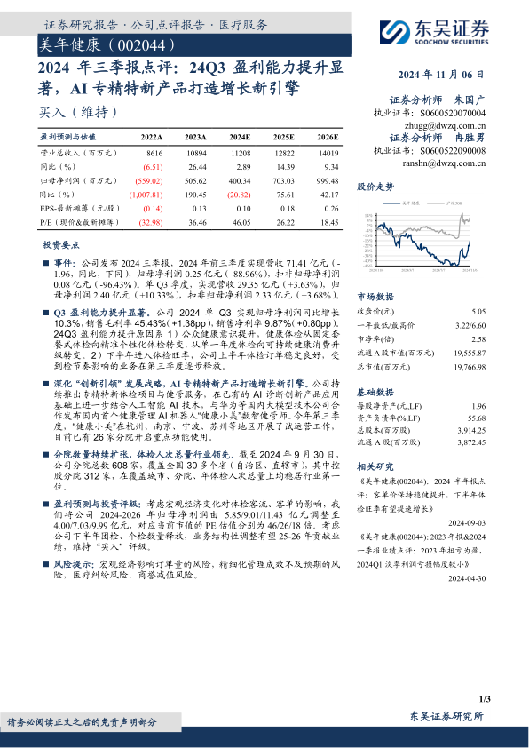 本报告分析了美年健康(002044)2024年三季报,核心观点如下: