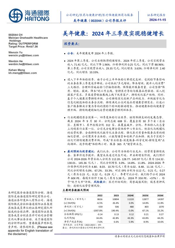 盈利预测与投资建议:我们认为,公司作为体检行业龙头,经营质量持续改善,客单价逐步提升,展望未来通过内生外延,开启新增长阶段。我们预计公司2024-2026年营业收入分别为112.20、128.77、143.97亿元(原为114.32、130.01、145.36亿元),同比分别增长3.0%、14.8%、11.8%,2024-2026年归母净利润分别为4.80、8.03、10.70亿元(原为6.02、8.48、11.16亿元),同比分别增长-5.0%、67.2%、33.3%,对应EPS分别为0.12元、0.21元、0.27元(原为0.15元、0.22元、0.29元)。参考可比公司,我们给予公司2024年60X PE,每股目标价7.36元(原为5.38元,2024年35X PE,+37%),给予“优于大市”评级。风险提示:医疗纠纷风险;商誉减值风险;股东质押风险;连锁化运营管理风险。