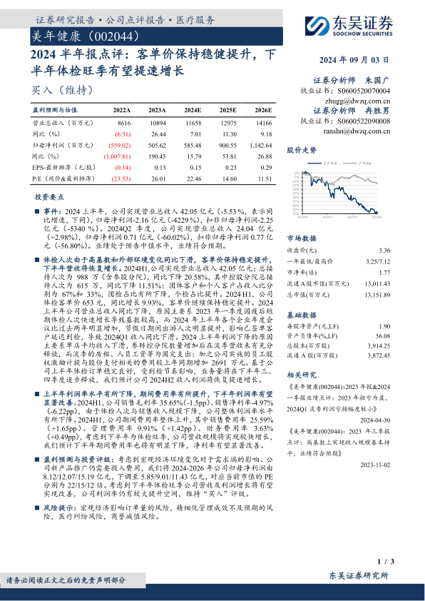 美年健康2024年上半年业绩受高基数和外部环境影响出现短期承压,营收和归母净利润同比下滑。然而,公司在客单价方面实现了近10%的稳健增长,且个人客户占比有所提升,显示出其业务韧性和市场适应性。尽管上半年利润率和费用率有所波动,但鉴于公司订单情况良好,预计下半年体检旺季将带动业务量和利润恢复增长。分析师基于对宏观经济和公司投入的考量,调整了未来三年的盈利预测,但仍维持“买入”评级,看好公司下半年的业绩改善潜力和利润率提升空间。投资者需关注宏观经济、管理成效、医疗纠纷及商誉减值等潜在风险。