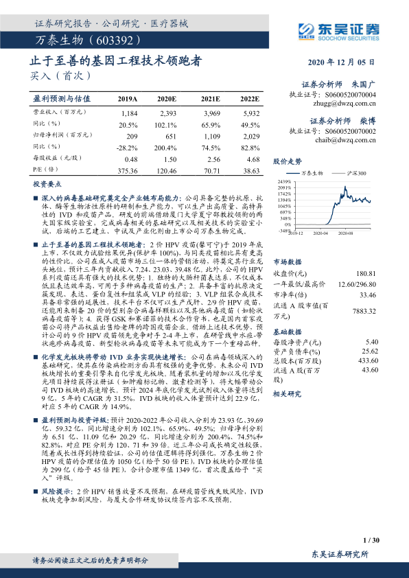 盈利预测与投资评级:预计2020-2022年公司收入分别为23.93亿、39.69亿、59.32亿,同比增速分别为102.1%、65.9%、49.5%;归母净利分别为6.51亿、11.09亿和20.29亿,同比增速分别为200.4%、74.5%和82.8%,对应PE分别为120、71和39倍。近三年公司成长确定性较强,随着成长性得到持续验证,公司的估值逻辑将得到强化,万泰生物2价HPV疫苗的合理估值为1050亿(给予50倍PE),IVD板块的合理估值为299亿(给予45倍PE),合计合理市值1349亿,首次覆盖给予“买入”评级。
