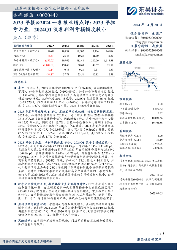 美年健康2023年成功扭亏为盈,业绩符合预期,客流客单双增长,数字化转型成效显著,盈利能力持续提升。尽管2024Q1受季节性因素影响出现亏损,但亏损幅度较往年收窄,公司盈利能力提升的逻辑逐步兑现。维持“买入”评级,但需关注客单提升不及预期、门店并购整合不及预期以及医疗质量纠纷等风险。