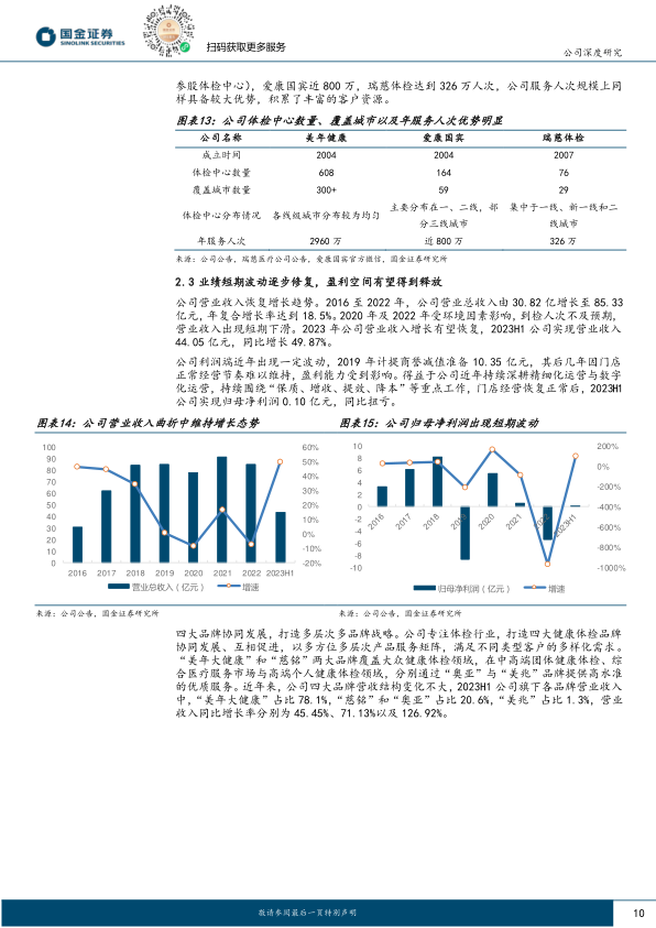专业体检行业龙头,持续推动内生与外延并重的高质量发展和可持续增长。公司在客户资源及收入规模层面,具备明显优势,2022年全年体检服务人次达2960万人,其中控股体检中心总接待人次为1839万人。公司业绩波动逐步修复,2023H1公司实现营业收入44.05亿元,同比增长50%。归母净利润扭亏,盈利空间有望得到释放。量价齐升,公司发展具备强劲动力。公司持续推出创新体检产品、优化业务结构,客单价平稳增长,2023H1达到594元,同比增长15%。截至2023年6月30日,公司旗下拥有608家体检中心,控股293家、参股315家,基本实现全国范围覆盖,公司采用参股转控股的扩展模式,随着旗下体检中心成熟度提升,有望实现内生和并购并重的可持续增长。