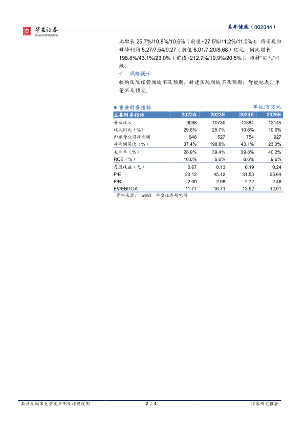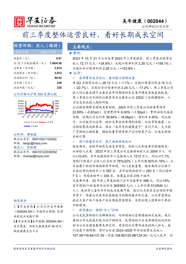 本报告对美年健康2023年前三季度的业绩进行了深入分析,认为公司整体运营良好,盈利能力持续改善,客户结构不断优化,维持“买入”评级。虽然面临一定的经营风险,但考虑到公司在民营体检行业的领先地位和精细化管理带来的效益,长期成长空间依然值得期待。