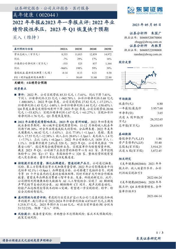 美年健康在2022年面临疫情带来的业绩挑战,但通过积极的战略调整和市场复苏,在2023年第一季度实现了超预期的强劲增长。公司在提升医疗服务质量、强化品牌建设和推动技术创新方面取得了显著进展,特别是大数据与AI技术的深度应用,为其未来发展奠定了坚实基础。分析师基于对行业前景和公司运营改善的信心,上调了盈利预测并维持“买入”评级,表明美年健康有望在后疫情时代迎来新的增长周期,但投资者仍需关注潜在风险。