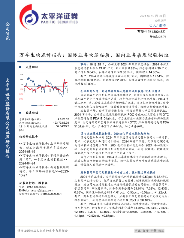 万孚生物在2024年前三季度展现出稳健且加速的财务增长,特别是第三季度扣非归母净利润实现近50%的显著增长,彰显了其核心业务的强劲势头。公司通过新产品FDA注册和渠道深耕,成功推动国际业务快速扩张,尤其在北美市场和定量平台表现突出。在国内市场,尽管面临政策影响,公司业务仍展现出较强韧性,化学发光等定量业务装机超预期,定性业务也取得良好进展。在盈利能力方面,公司通过产品结构优化和精益管理,实现了毛利率和净利率的持续提升,费用控制得当,尽管汇兑损益对财务费用有所影响。展望未来,万孚生物凭借其在国际国内市场的双轮驱动策略和持续的创新能力,预计将保持良好的增长态势,太平洋证券维持其“买入”评级。