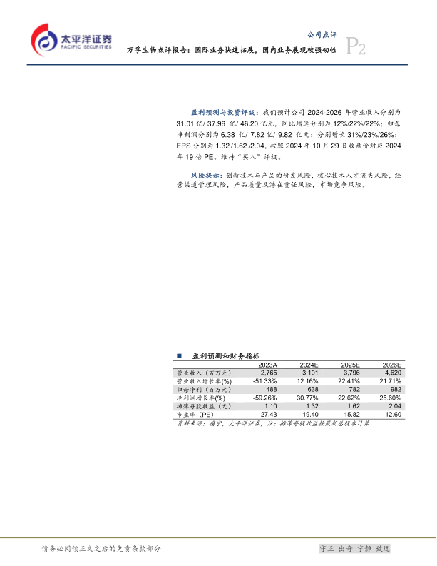 基于公司稳健的业绩表现和清晰的增长路径,太平洋证券对万孚生物的未来业绩进行了预测。预计公司2024-2026年营业收入分别为31.01亿/37.96亿/46.20亿元,同比增速分别为12%/22%/22%;归母净利润分别为6.38亿/7.82亿/9.82亿元,分别增长31%/23%/26%。摊薄每股收益(EPS)预计分别为1.32/1.62/2.04元。按照2024年10月29日收盘价,对应2024年19倍PE。鉴于公司国际业务的快速拓展和国内业务的强劲韧性,以及持续优化的盈利能力,太平洋证券维持万孚生物“买入”评级。同时,报告也提示了创新技术与产品研发、核心技术人才流失、经营渠道管理、产品质量及潜在责任、市场竞争等潜在风险。