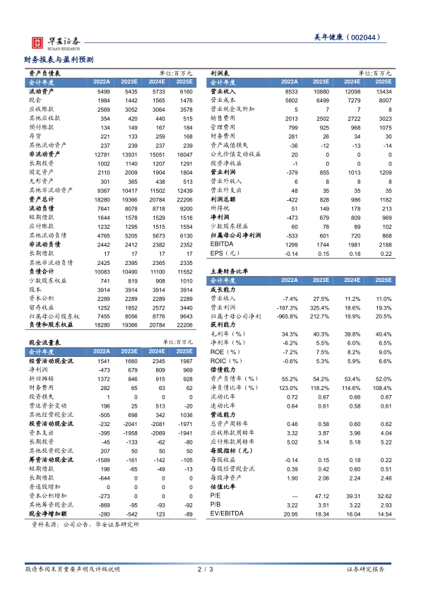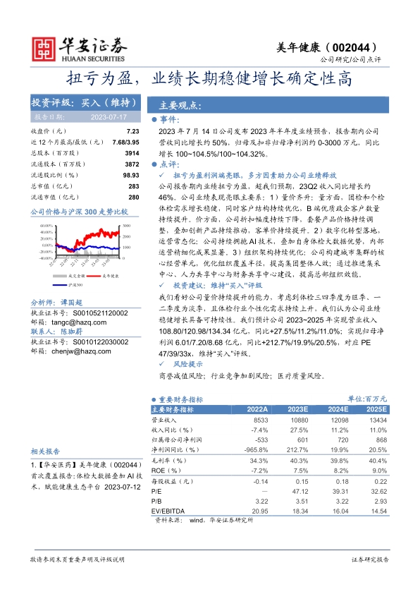 本报告对美年健康2023年半年度业绩预告进行了分析,认为公司通过量价齐升、数字化转型和组织架构优化等多重因素驱动,实现了业绩的显著增长和扭亏为盈。考虑到体检行业旺季因素及个性化需求上升,看好公司量价齐升能力,维持“买入”评级。同时,报告也提示了商誉减值、行业竞争加剧和医疗质量等风险。