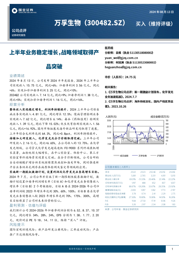 万孚生物2024年上半年业绩稳健增长,盈利能力持续提升,研发投入加大,并在化学发光和分子诊断领域取得突破。公司实施新一期股权激励计划,彰显了对未来发展的信心。维持“买入”评级,但需关注国际宏观环境、新产品研发注册、汇率波动以及产品推广等风险。