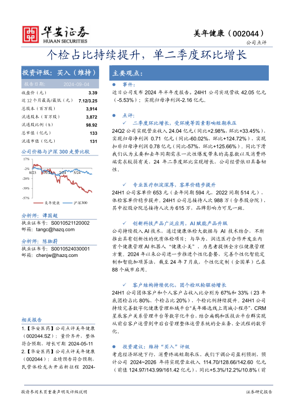 24H1公司客单价653元(去年同期594元,2022同期514元),体检客单价稳步提升。24H1公司总接待人次988万(含参股分院),其中控股分院总接待人次为615万,品牌影响力可见一斑。