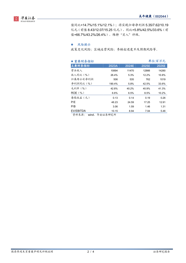 报告维持对美年健康的“买入”评级,但同时提示了政策变化、区域运营以及参股转控股进度等风险。报告还对公司未来几年的营收和利润进行了预测,并给出了相应的财务指标。