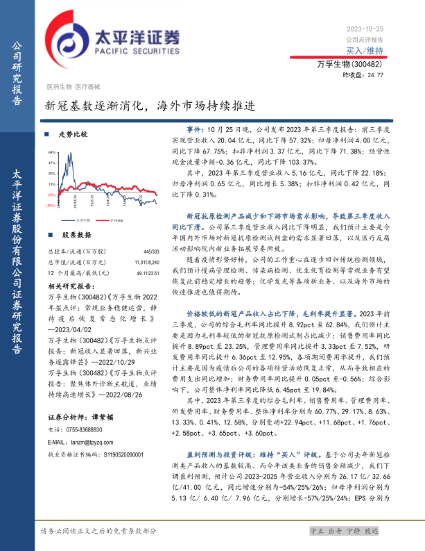 本报告对万孚生物2023年第三季度报告进行了详细分析,指出公司业绩受到新冠疫情影响,但常规业务有望恢复增长,新兴业务和海外市场将成为新的增长动力。报告分析了公司的盈利能力、财务数据,并维持“买入”评级。同时,报告也提示了汇率波动、地缘政治、新品市场竞争和行业政策等风险。