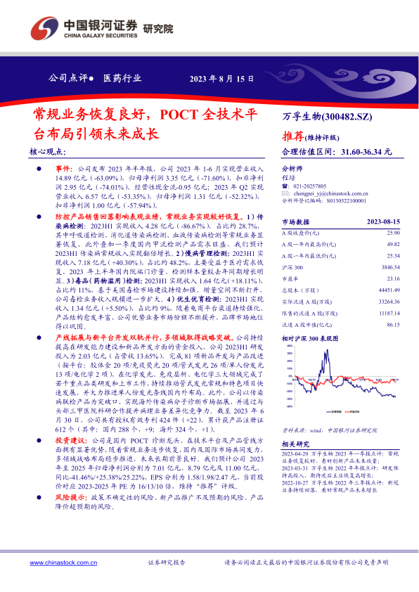 本报告认为,万孚生物作为国内POCT诊断龙头,虽然短期业绩受到防控产品销售回落的影响,但常规业务恢复良好,且公司在技术平台和产品管线方面拥有显著优势。随着国内及国际市场共同发力,公司多领域战略布局稳步推进,未来长期前景良好。维持“推荐”评级,并提示相关风险。