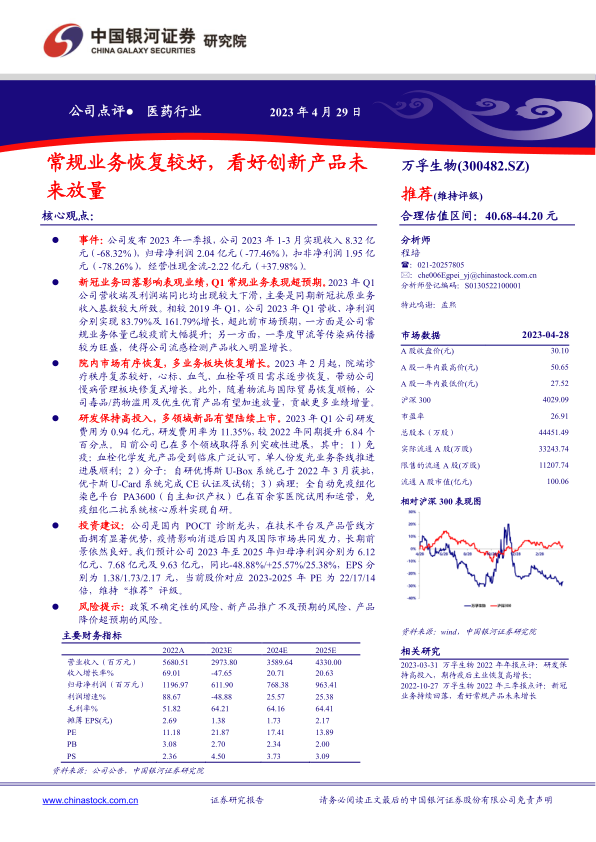 本报告对万孚生物2023年一季报进行了深入分析,认为公司在新冠业务回落后,常规业务恢复良好,且研发投入持续加大,多领域创新产品有望陆续上市。维持对公司的“推荐”评级,并给出了合理的估值区间。同时,报告也提示了政策、产品推广和降价等方面的风险。