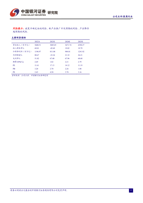 投资建议:公司是国内POCT诊断龙头,在技术平台及产品管线方面拥有显著优势,随着疫情褪去,国内及国际市场共同发力,长期前景依然良好。我们预计公司2023-2025年净利润为8.11/9.84/12.42亿元,同比-45.69%/+19.02%/+19.79%,EPS为1.82/2.21/2.79元,当前股价对应PE为17/14/11倍,维持“推荐”评级。