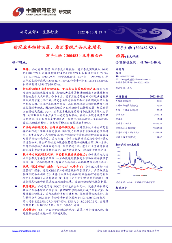 本报告对万孚生物(300482.SZ)2022年三季度业绩进行了分析,认为公司新冠检测相关业务持续回落,但常规检测产品未来增长可期。