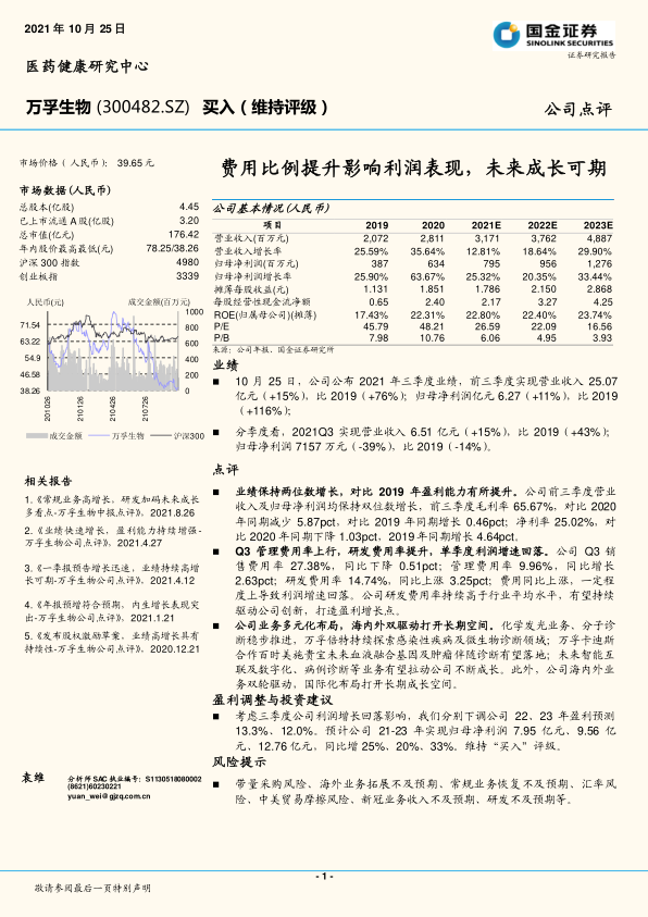 本报告对万孚生物(300482.SZ)的最新业绩进行了深入分析,核心观点指出,尽管公司在2021年第三季度面临费用比例提升导致的短期利润增长回落,但其整体业务保持稳健的两位数增长,且盈利能力相较2019年有所提升。公司通过持续的研发投入和多元化的业务布局,包括化学发光、分子诊断以及海内外市场双轮驱动策略,为未来的长期成长奠定了坚实基础。
