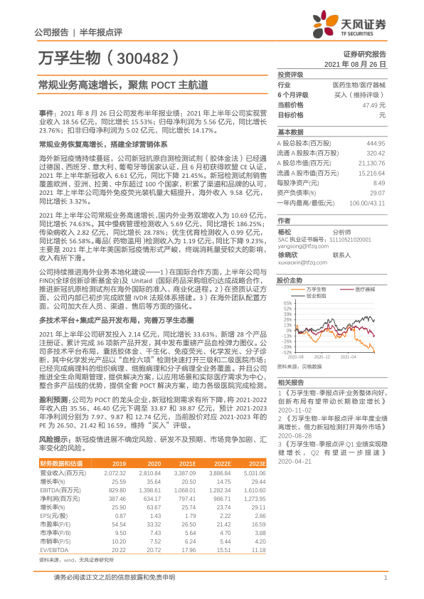 本报告对万孚生物2021年半年度业绩进行了分析,核心观点如下: