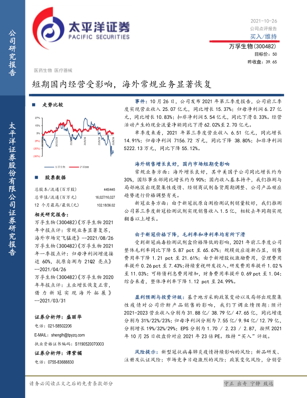 本报告对万孚生物(300482)2021年第三季度报告进行了分析,并维持“买入”评级。