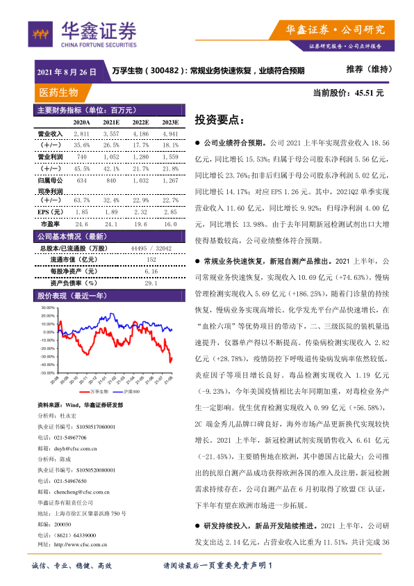 万孚生物在2021年上半年表现出强劲的业绩韧性与增长潜力。尽管新冠检测试剂业务面临高基数挑战,但公司通过常规业务的快速恢复和增长,成功抵消了部分影响,实现了归母净利润23.76%的同比增长。特别是慢病管理、化学发光等常规业务的显著增长,以及在分子诊断和新冠自测产品方面的持续研发投入和市场拓展,为公司未来的可持续发展奠定了坚实基础。华鑫证券基于对公司未来盈利能力的积极预期,维持“推荐”评级,但同时提示了产品注册、政策变化及汇率波动等潜在风险。