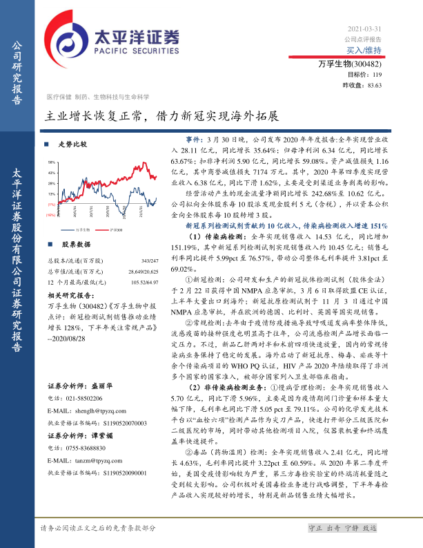 本报告对万孚生物(300482)进行了公司点评,维持“买入”评级,目标价为119元。报告分析了公司2020年年度报告,指出公司主业增长恢复正常,并借力新冠疫情实现了海外拓展。
