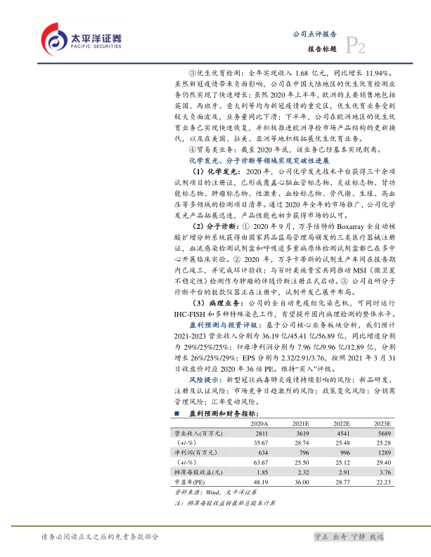 太平洋证券维持对万孚生物的“买入”评级,并给出了相应的盈利预测。然而,投资者也应关注疫情影响、新品研发、市场竞争、政策变化、分销商管理和汇率变动等风险因素。