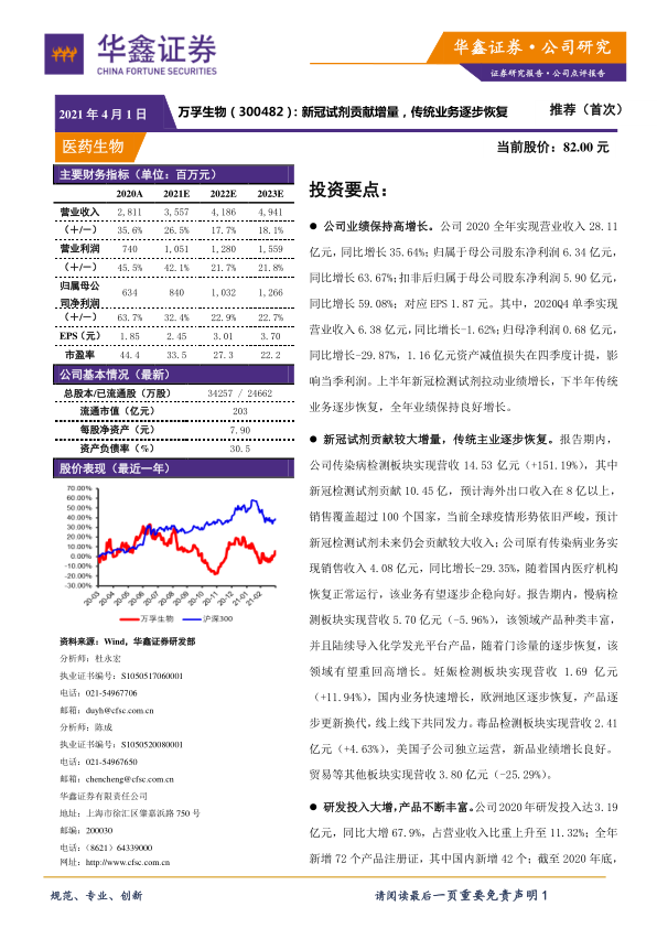 万孚生物在2020年实现了显著的业绩增长,营业收入和归母净利润分别同比增长35.64%和63.67%。这一增长主要得益于新冠检测试剂的巨大贡献,同时,随着国内医疗机构的逐步恢复,公司传统主营业务也呈现企稳向好态势。公司通过加大研发投入,不断丰富产品线并导入新技术平台,为未来的持续增长奠定了基础。
