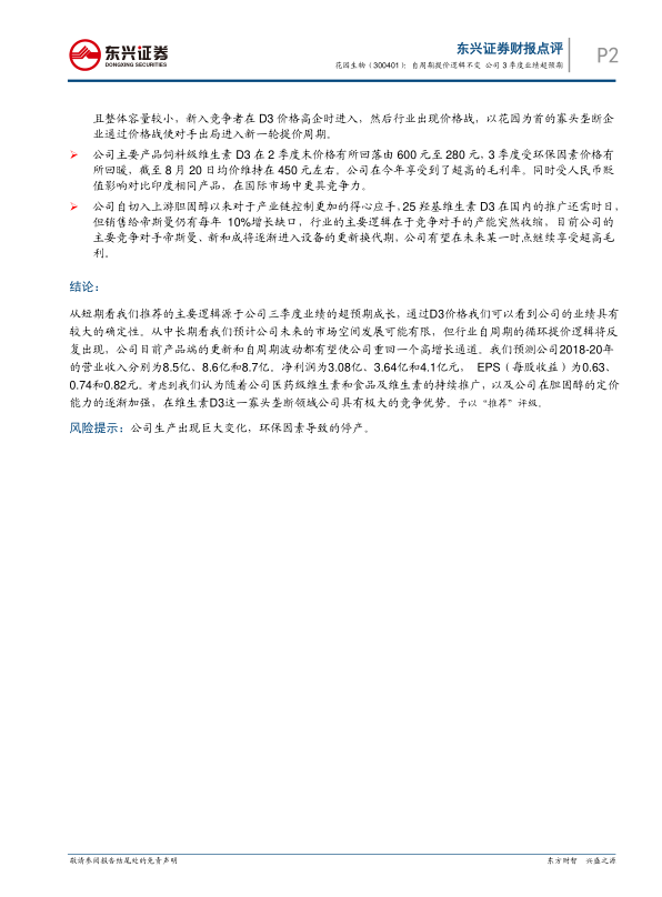 从短期看我们推荐的主要逻辑源于公司三季度业绩的超预期成长,通过D3价格我们可以看到公司的业绩具有 较大的确定性。从中长期看我们预计公司未来的市场空间发展可能有限,但行业自周期的循环提价逻辑将反 复出现,公司目前产品端的更新和自周期波动都有望使公司重回一个高增长通道。我们预测公司2018-20年 的营业收入分别为8.5亿、8.6亿和8.7亿。净利润为3.08亿、3.64亿和4.1亿元, EPS(每股收益)为0.63、 0.74和0.82元。考虑到我们认为随着公司医药级维生素和食品及维生素的持续推广,以及公司在胆固醇的定价 能力的逐渐加强,在维生素D3这一寡头垄断领域公司具有极大的竞争优势。予以“推荐”评级。