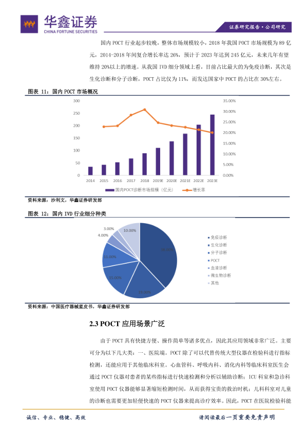 国内POCT行业起步相对较晚,整体市场规模尚小。2018年,我国POCT市场规模为89亿元人民币,2014年至2018年间的复合增长率达到26%。预计到2023年,国内POCT市场规模将达到245亿元人民币,未来几年有望维持20%以上的复合增速。从我国IVD细分领域结构来看,目前占比最大的是免疫诊断,其次是生化诊断和分子诊断,而POCT的占比仅为11%。这与发达国家POCT在IVD中30%左右的占比存在较大差距,预示着国内POCT市场拥有巨大的增长潜力和发展空间。