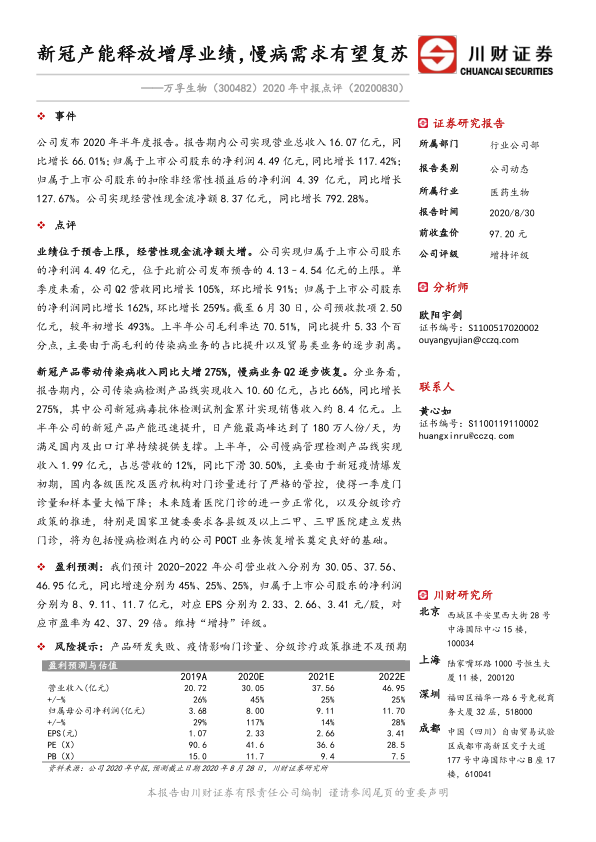 万孚生物2020年中报表现亮眼,新冠相关产品销售额大幅增长,带动公司整体业绩提升。虽然慢病业务受到疫情影响,但未来有望随着医疗机构的正常化运营和政策支持而复苏。维持对公司未来盈利的乐观预测和“增持”评级。
