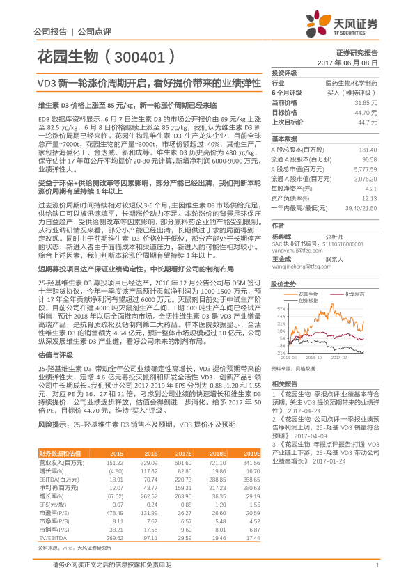 本报告核心观点认为,花园生物作为维生素D3(VD3)行业的龙头企业,正迎来新一轮VD3涨价周期,这将显著提升公司业绩弹性。公司凭借其在VD3市场的领先地位(市场份额超过40%),将充分受益于环保趋严和供给侧改革带来的行业整合效应。同时,公司在25-羟基维生素D3、灭鼠剂和全活性维生素D3等募投项目上的布局,为其中长期成长提供了坚实的多元化产品基础。