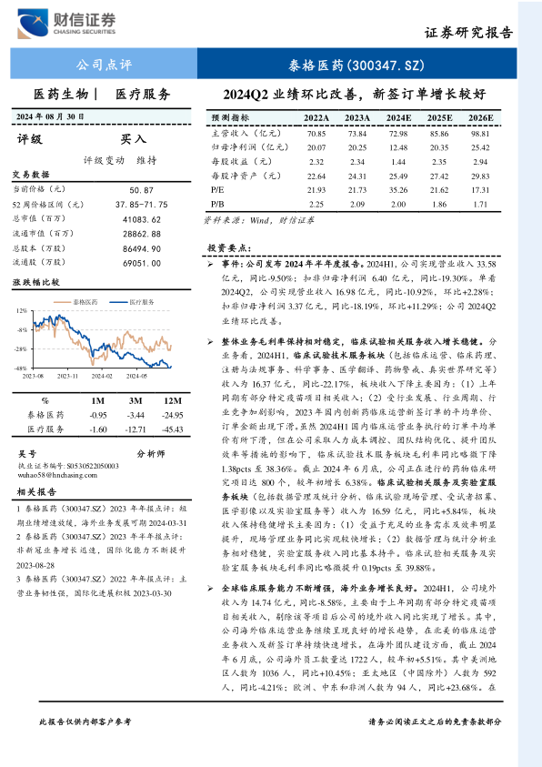 泰格医药在2024年第二季度展现出业绩环比改善的积极信号,尽管上半年整体业绩受特定项目高基数和行业竞争影响有所承压,但公司通过精细化管理和效率提升,保持了核心业务毛利率的稳定。公司在全球化战略上持续发力,海外业务实现良好增长,并通过战略收购进一步巩固了国际市场地位。随着国内生物医药行业的回暖,公司新签订单表现强劲,为未来业绩增长提供了有力支撑。基于分部估值法,财信证券维持对泰格医药的“买入”评级,并给出了明确的目标价格区间,反映了对公司长期发展潜力的认可。