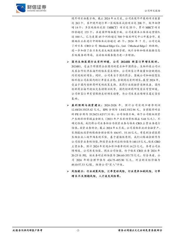 盈利预测与投资建议:2024-2026年,预计公司实现归母净利润12.48/20.35/25.42亿元,EPS分别为1.44/2.35/2.94元,当前股价对应的PE分别为35.26/21.62/17.31倍。公司估值方面,由于公司股权投资产生的非经常损益金额大(2023年产生非经常性损益5.48亿元)、不确定性高,我们将公司业务拆分为投资业务与临床CRO主营业务进行估值。投资业务部分,截止2024年6月底,公司其他非流动金融资产、长期股权投资的账面余额分别为104.97、35.18亿元,考虑到当前医药生物企业二级市场表现不佳,基于谨慎性原则,我们以账面余额作为公司投资业务的估值,即投资业务对应的估值为140.15亿元。临床CRO主营业务,预计2024年实现扣非归母净利润14.23亿元,参考公司业绩增速、公司历史估值、同业公司估值,给予临床CRO业务2024年20-25倍PE,该业务对应的估值为284.60-355.75亿元。综合来看,公司2024年的合理市值为424.75-495.90亿元,对应的目标价格为49.10-57.33元/股,维持公司“买入”评级。