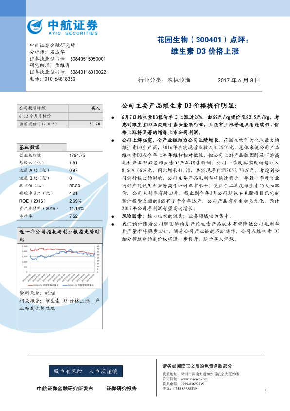 本报告对花园生物(300401)进行了深入分析,认为维生素D3价格上涨将显著增厚公司利润,全产业链布局和上游拓宽将助力公司业绩增长。报告预测公司未来几年营业收入和净利润将保持高速增长,维持“买入”评级。同时,报告也提示了核心技术流失和业务领域集中的风险。