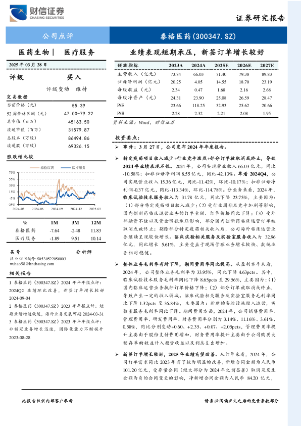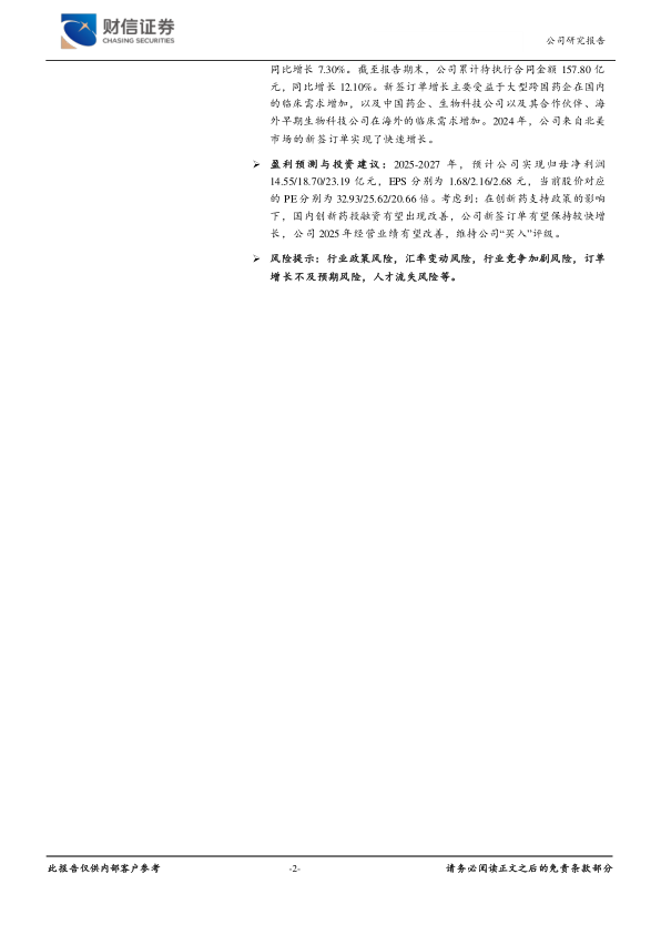 基于新签订单的良好增长和创新药支持政策的积极影响,预计国内创新药投融资环境有望改善,公司2025年经营业绩有望改善。财信证券预测公司2025-2027年归母净利润分别为14.55亿元、18.70亿元和23.19亿元,对应EPS分别为1.68元、2.16元和2.68元。当前股价对应的PE分别为32.93倍、25.62倍和20.66倍。鉴于此,维持公司“买入”评级。