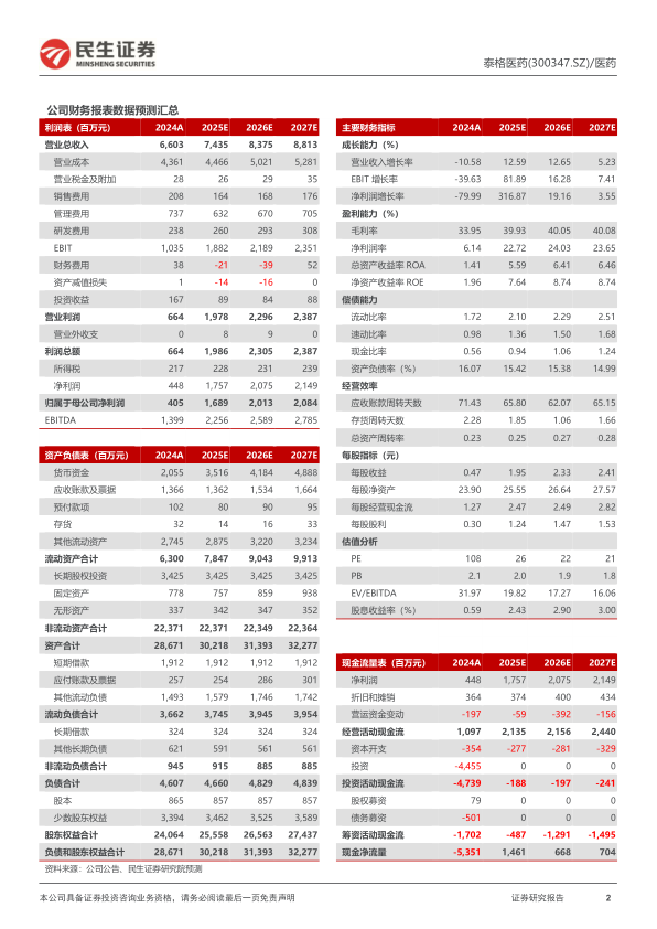 泰格医药作为中国临床CRO外包龙头企业,在保持国内市场占有率领先的同时,正加速开拓海外市场。民生证券研究院预计,2025年至2027年公司营业收入将分别达到74.35亿元、83.75亿元和88.13亿元,同比增长率分别为12.6%、12.6%和5.2%。归属于母公司股东的净利润预计分别为16.89亿元、20.13亿元和20.84亿元,对应PE分别为26倍、22倍和21倍。鉴于其战略布局和增长潜力,分析师维持对泰格医药的“推荐”评级。