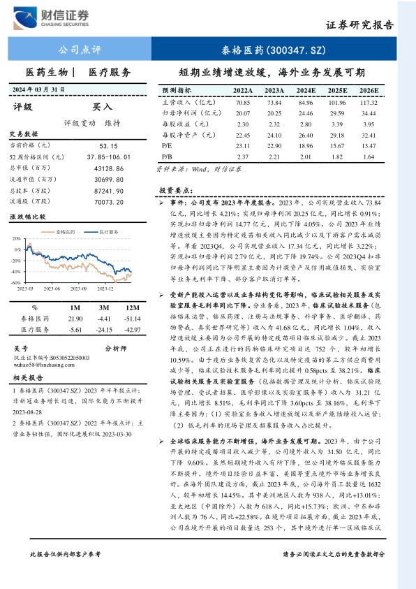 本报告分析了泰格医药(300347.SZ)2023年的业绩表现,指出公司短期业绩增速放缓,主要受特定疫苗相关收入减少和下游客户需求减弱的影响。但同时强调,公司全球临床服务能力不断增强,海外业务发展可期,预计2024年业绩有望实现稳健增长。