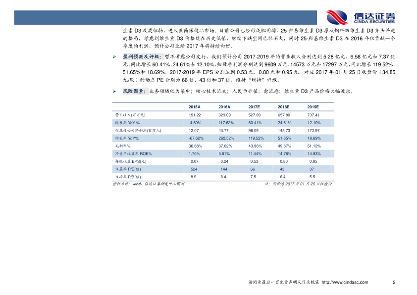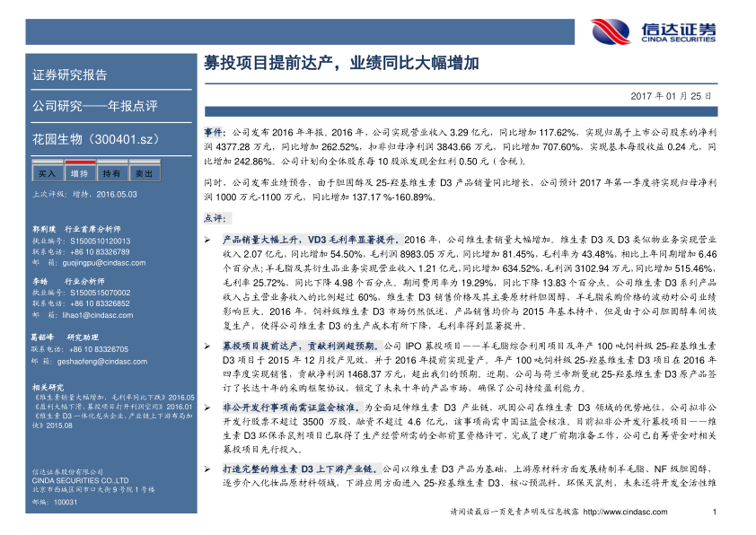 本报告分析了花园生物2016年年报,指出公司业绩大幅增长主要受益于产品销量上升和募投项目提前达产。维生素D3销量增加及毛利率提升,募投项目贡献超预期利润。公司致力于打造完整的维生素D3产业链,并拟通过非公开发行进一步扩张。预计公司未来业绩将持续向好,但同时也存在一定的风险因素。