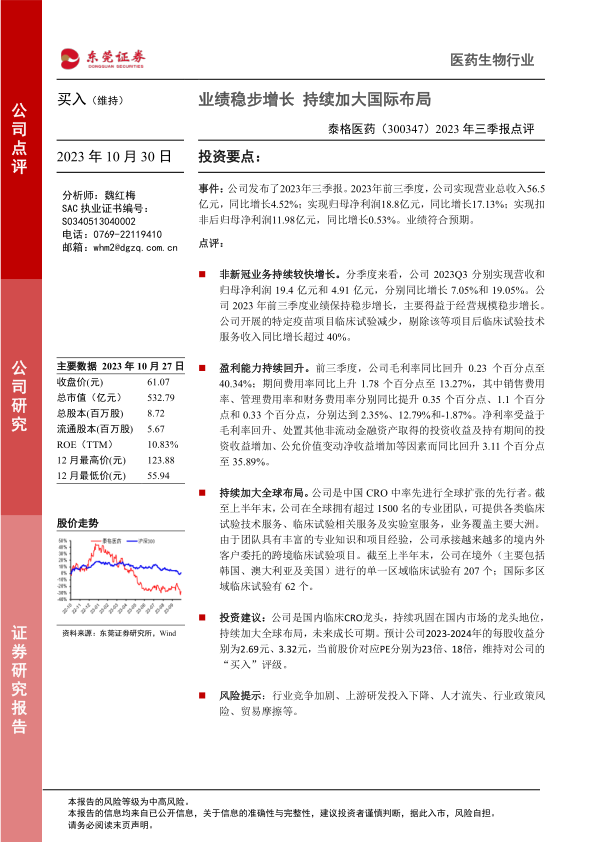 东莞证券维持对泰格医药的“买入”评级,但同时也提醒投资者关注行业竞争、政策变动等风险因素。