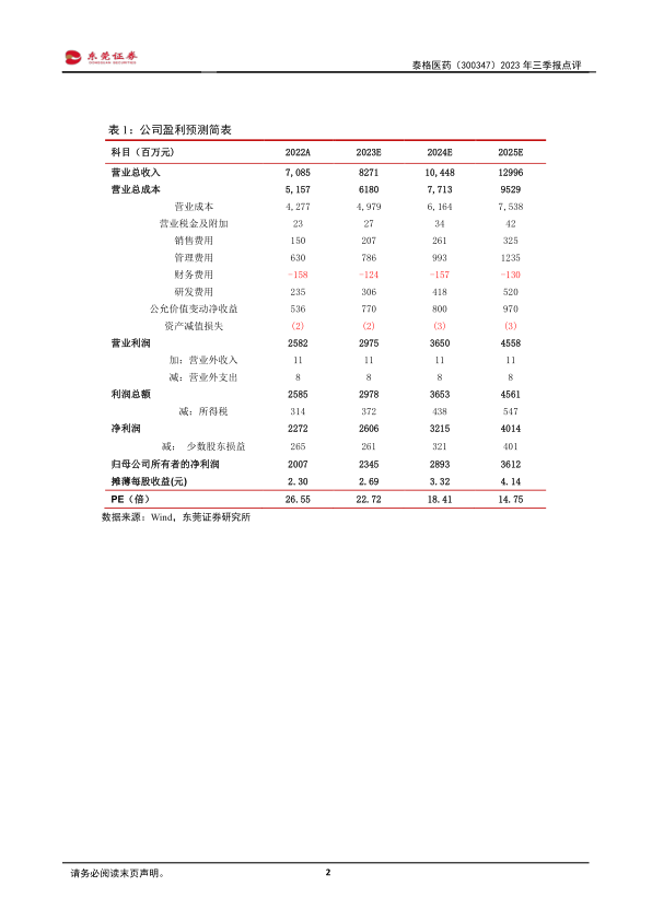 预计公司2023-2024年的每股收益分别为2.69元、3.32元,当前股价对应PE分别为23倍、18倍,维持对公司的“买入”评级。