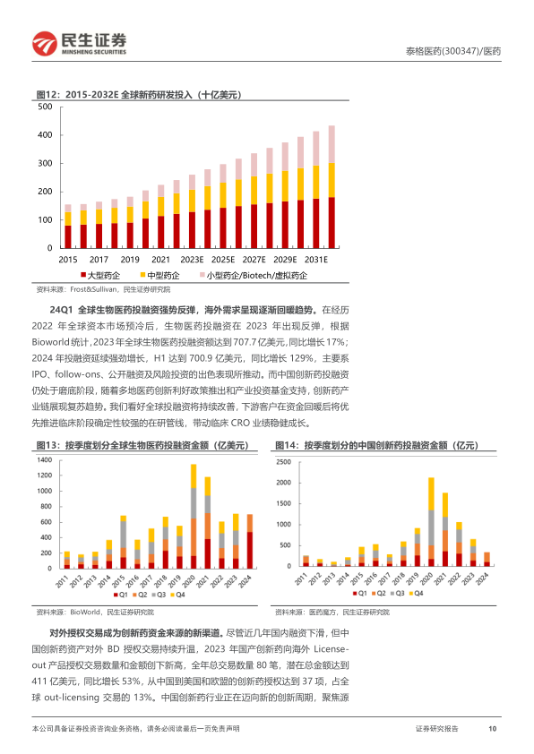 从需求看,全球生物医药投融资触底反弹,创新需求回暖趋势确定,中国本土优质创新药在全球范围获得认可,中国临床试验活动仍然强劲,对于CRO的需求将稳健提升。从供给看,临床CRO市场持续扩容、渗透率保持增长,未来中国临床CRO市场集中度将不断提升,头部规模效应将逐步凸显,泰格等龙头企业将不断提高临床CRO服务国际竞争力和市场份额。在政策端,国家高度重视创新药产业发展,医药政策边际回暖,从研发、审批、准入、支付等环节全链条支持创新药高质量发展,并且各地医药产业基金也陆续成立和投资,带动国内生物医药投融资回暖和需求复苏。