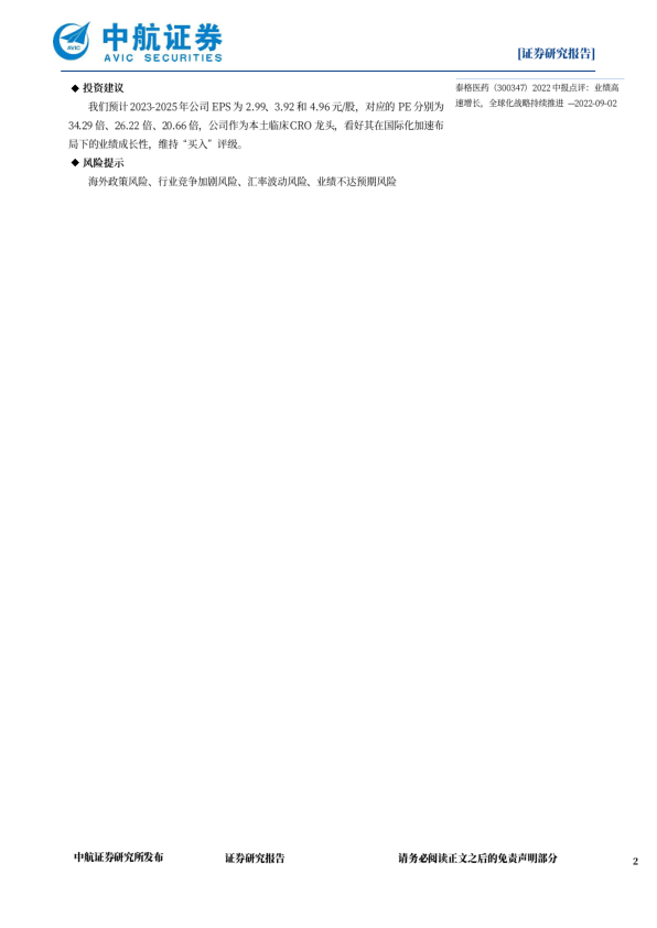 我们预计2023-2025年公司EPS为2.99、3.92和4.96元/股,对应的PE分别为34.29倍、26.22倍、20.66倍,公司作为本土临床CRO龙头,看好其在国际化加速布局下的业绩成长性,维持“买入”评级。
