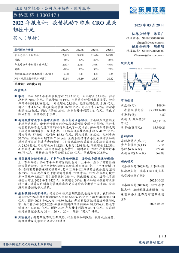 2022年报点评:疫情扰动下临床CRO龙头韧性十足